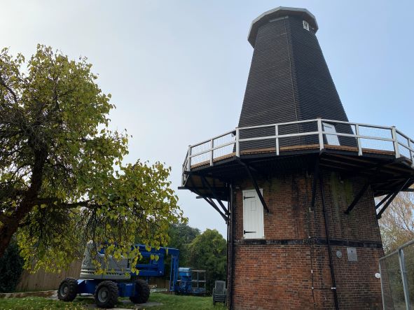 Meopham Mill has the potential to become a working windmill again. Restoration of the cap, sweeps and machinery will allow it to mill corn into flour, using only the power of the wind. In 2021, Kent County Council and the Meopham Windmill Trust started the process of restoring the windmill to working order. Phases 1 and 2 involved repairing the wooden tower of the mill and renewing the external reefing stage at second floor level. Phase 3 of the restoration will commence in Autumn 2022, and will involve repairs to the cap roof of the mill. The cap is designed to rotate as the wind changes, but it is currently seized in one position. The fantail at the back of the cap has been removed for safety. The four sweeps will be renewed during phase 4 of the restoration. Once they are back in position, the windmill's sweeps will be able to turn regularly. Inside the mill, the drive gearing and millstones will be overhauled and set up for operation. Specialist millwright contractors will carry out the repairs to the cap roof and sweeps of the windmill. At the start of this process, a mobile crane will lower the existing sweeps and the cap to ground level. Most of the work involved in phases 3 and 4 will take place off site. The cap roof will be restored, and new sweeps built, at the millwright's 'Repair Shop' in East Anglia. While the repairs are in progress, a temporary flat roof will be fitted to the top of the mill for weather protection. The new sweeps are expected to be back in position and turning by the end of 2023. What will happen on site this year? To dismantle and lower the sweeps and cap, a large mobile crane will be needed. This must be placed as close to the base of the windmill as possible. A mobile elevated work platform or 'cherry picker' will also be needed to enable the fixings of the sweeps to be dismantled safely. Temporary alterations to the site will be needed in order to allow the crane and cherry picker to get close to the base of the windmill. The existing access track will be widened and the parish council notice board will be relocated. Once restoration of the mill is complete, the site will be returned to its present grassed appearance. |